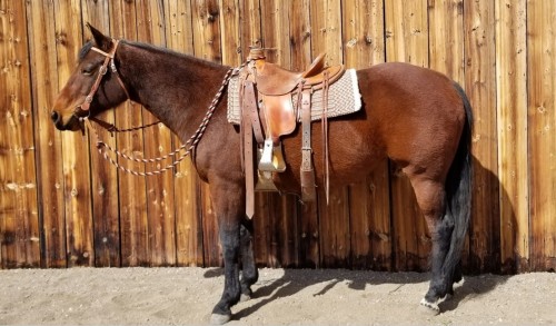 Roxey was bred on the Open Spear Ranch in Montana. As a 2 year old she was started in the Montana State University Horsemanship. As a 3 year old, she came to live on our ranch in Del Norte, CO and has had experience in all aspects of ranch work. She has been roped off of, ridden through every kind of terrain imaginable, packed salt, gathered and sorted cattle. She has also been ridden extensively in the arena and is a light, well balanced horse and is well schooled in all aspects of groundwork. While she has extensive ranch experience, she excels in the arena, she loves a good trail ride, and is a people oriented horse.