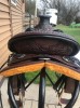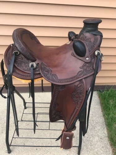 Opportunity to own a Brand new Custom Made JJ Maxwell Wood Post Wade Saddle without the 5 month wait!! Custom made with all the extras Ready to ship today. This Wood Post Wade Saddle is Brown leather w/antique paste, black rawhide bindings, 3 piece custom tooled Cheyenne roll. Hard seat w/ deep pocket. Custom Hand Tooled Exodus extra tooling pattern. Bucking rolls, 4 inch cantle, Hope Rigging-lessens cinch pressure, spreads pressure down the side of the saddle. Tree is an LT wood covered with fiberglass, most commonly used as it fits most horses. Provides more flare in front and more rock/curve front to back. JJ Maxwell saddles are known for their comfort they provide both horse and rider.