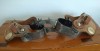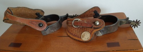 Here are a pair of Western Spurs stamped with RB and on the other side BW. I can’t find the maker. They’re in great shape and have really nice leather basket weave spur straps with a nice concho. These are in great shape!