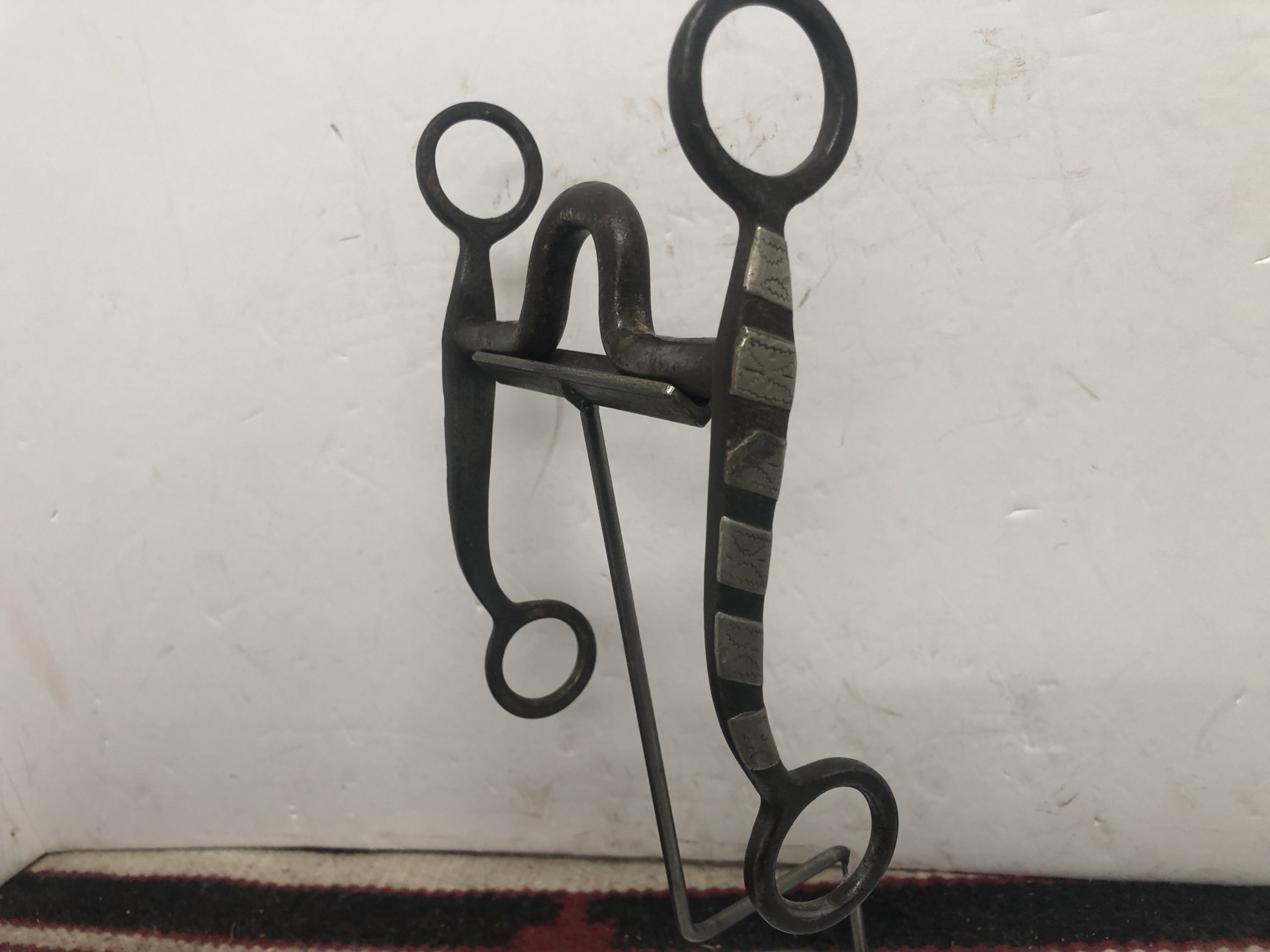Early CROCKETT marked on the inside of the cheek. 7" cheeks, 5 1/8" mouth. Pics show where a small corner of one piece of silver is missing and that there are some dings in some of the mountings. It is a very early bit that is collectible and still usable. Has been in a collection for years, selling last at the famous High Noon auction. We pay shipping within the 48 states. We accept most credit cards, Pay Pal, money order, check.