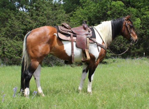 If you are looking for a nice horse to use on the ranch or ride on trails, one that is gentle, well broke and sure to turn heads everywhere you take her, then check out Splash. She is a 14 year old tri-color paint mare, 14.3hh and extremely well built with a big hip, pretty head with a kind eye, and tons of chrome with her flashy color and long, thick mane and tail. Splash is extremely gentle with excellent ground manners, and she loves people and attention. She has been used for all phases of ranch work, including sorting pairs, roping and doctoring cattle in the pasture, and checking fence, and has spent some time in the feedyard. She has also been ridden English and has carried a flag in parades. Splash is a pleasure to ride out in the pasture, crosses water with no problem, and isn’t spooky. She has a very good handle, one handed neck rein, will sidepass and move off your leg. She rides quietly on a loose rein, has nice smooth gaits, is good on both leads, and will work a gate. Splash is not mare-ish and can be ridden next to or turned out with other mares and gelding without issue. She has never offered to buck, rear, bite kick or take off, and is suitable for advanced beginner riders and up. She has also been ridden alongside the road and in traffic and isn’t bothered by it. Asking $6500. Splash recently had shoes, teeth and coggins done so she is ready to go. Call for more information: Aubrey at 830-377-7236 or Wendy at 210-363-1883. Serious inquiries only, no tire kickers! Delivery anywhere is the US is available.