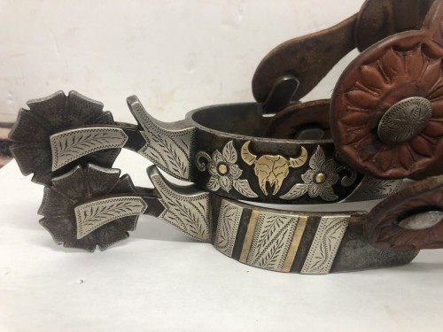 Double mounted pair in very good condition with the old block mark, 1 1/8’ bands, 1 1/2" rowels, 2 1/4" shanks. Marked Bob Marrs leathers. Very quality pair by a top maker. We accept most forms of payment. Buyer pays $8.00 shipping.