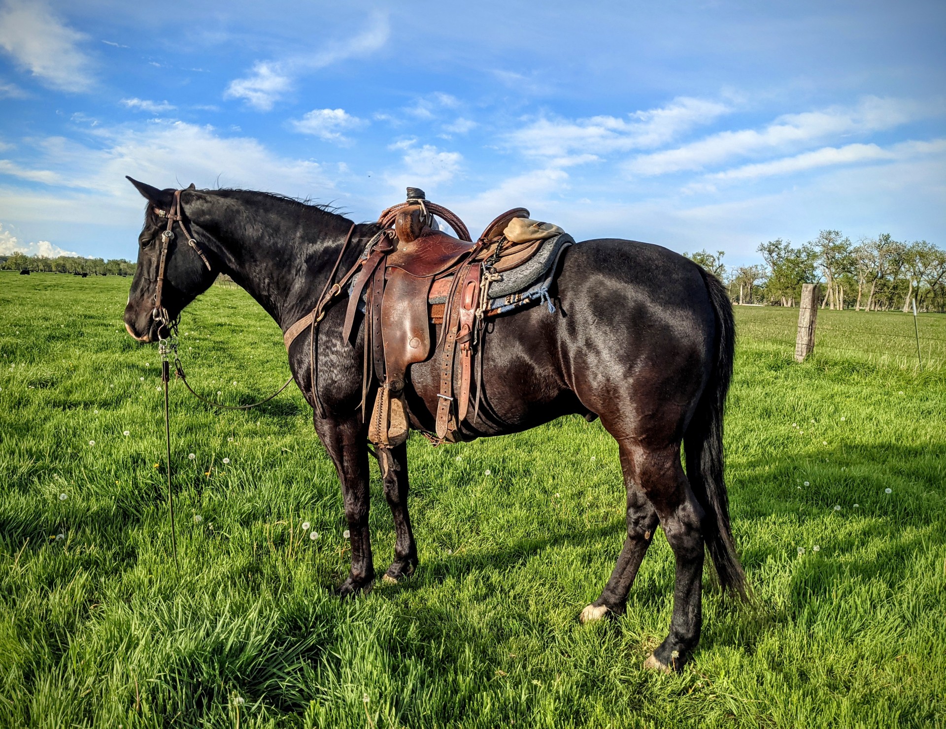 Si is an outstanding 8 year old ranch horse in his prime. He’s really gentle, reins nicely, and very well rounded. I’ve used him the past few years to sort cattle at the two stockyards here in Billings as well as perform all aspects of ranch work. He’s been used to rope and doctor yearlings, drag calves at brandings, knows his way around a gate all too well, pulls the calf sled with ease, and is really fun to sort cattle on. I can let anyone ride him and trust that he’ll be a gentleman as well as jump on him and go get a job done in a timely manner. He’s well built, good sized, very solid all the way around. I don’t think bucking has ever even crossed his mind. He’s a mellow fellow who can turn it on if you want to cut a cow or chase something down. Fresh shoes, I wormed him today, and he’s recently had his 5-way + WNV shot. This is one of the nicest horses I’ve ever had the opportunity to sell. I have more pictures and a video or two of him if you’re interested, please don’t hesitate to give me a call; I’d love to tell you more about him. My reputation is important to me. I try to be 100% honest and care about not only the horses I own but the people who put their trust in me when buying a horse. The price is certainly negotiable depending on the amount of interest I receive. My name is Mick Mosher and I appreciate you taking the time to read my ad.