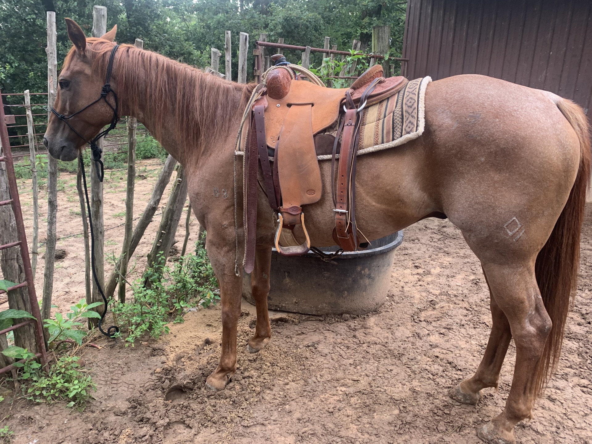 “Izzy” a Red roan seasoned ranch horse , 13 yr old, 15.1 hands, 1150 lbs, black footed and tough as can be. Rides around real good , gentle enough , used all his life on the same ranch. Penned lots of cattle in the swamps of Louisiana and Mississippi, caught his fair share, used with packs of dogs. Pulls good and works a gate. Good all around ranch horse for a lot of folks that use them to make a living.