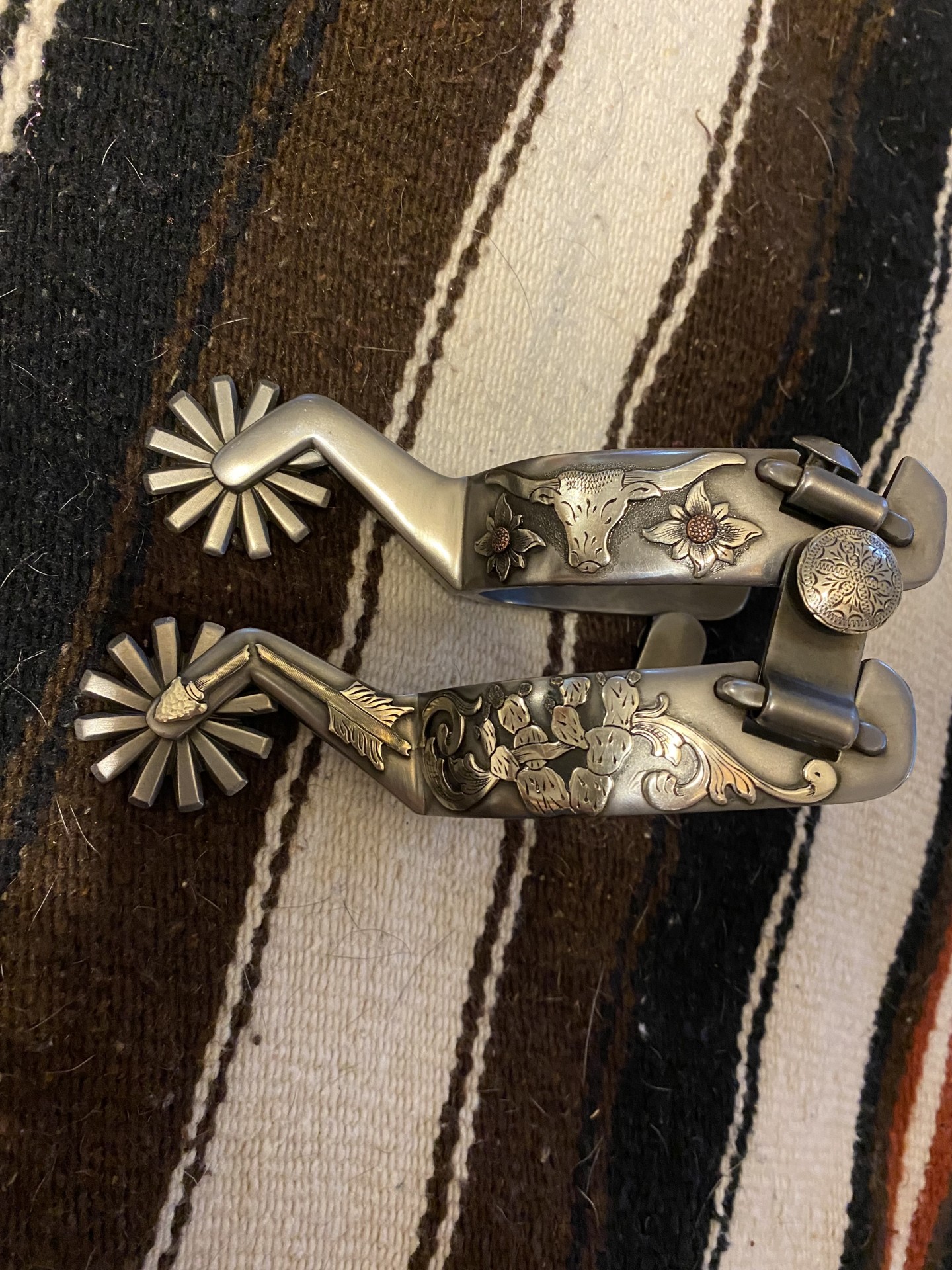 Really nice pair double mounted spurs handmade by John Jennings. New condition. $850 shipped in lower 48. PLEASE TEXT OR CALL ONLY. Thank you