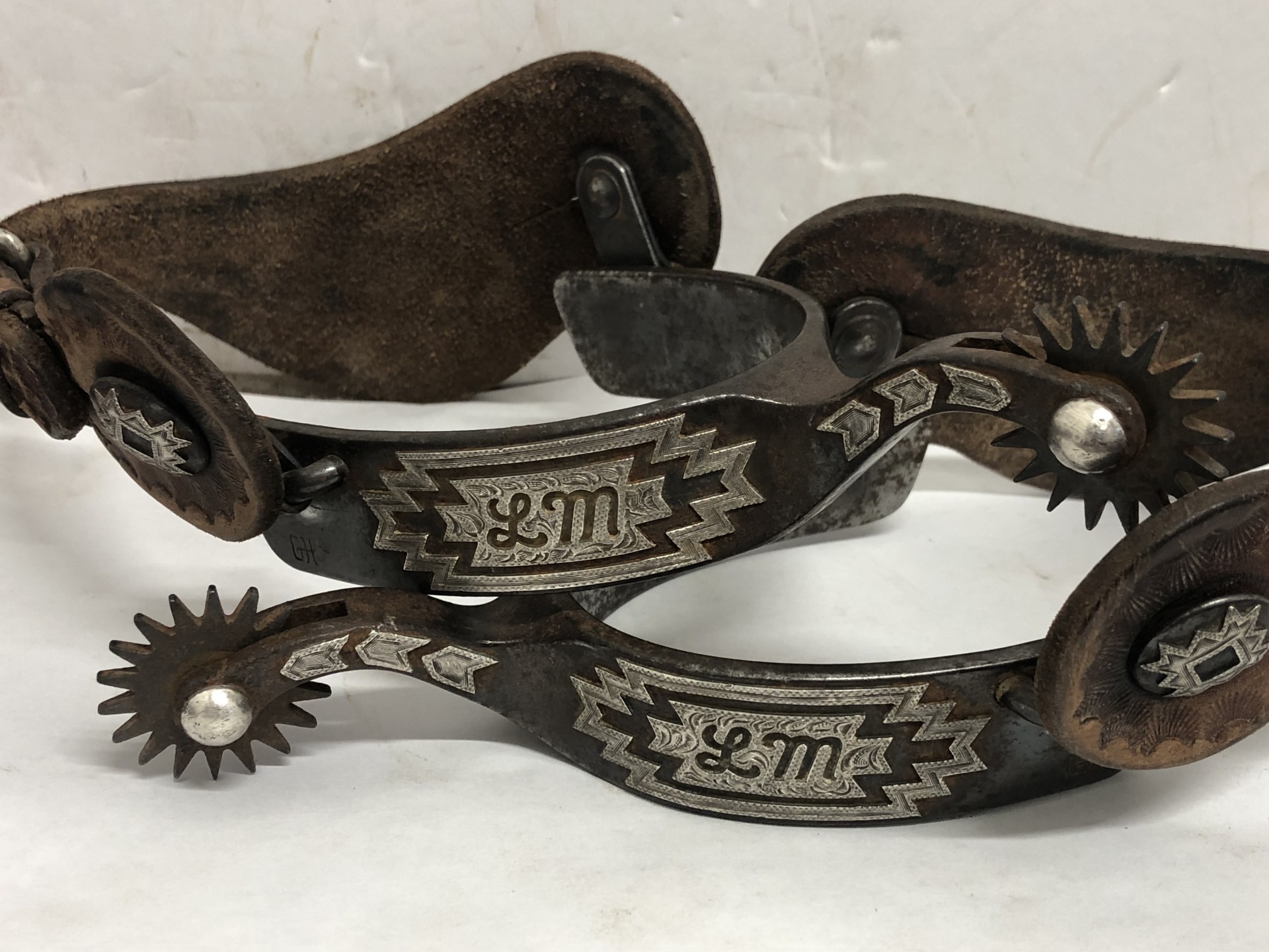 GH marked spurs by the late Gordon Hayes of California. Good condition. 15/16" bands, 2 7/8" heel openings that can be spread, 2 3/16" shanks. Straps included. We pay shipping within the 48 states and accept most forms of payment.