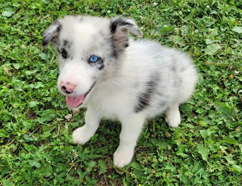 A blue merle male, pup #2 has a beautiful coat with lots of color, a white collar, and white tips on his feet and tail. While it is possible that eye color can continue to change up to a year of age, this pup currently has 1 striking blue eye, and one brown. Blue eyes are common in merles, so I imagine this will remain. A beautiful rarity, merle border collies are always in high demand, and always go quickly. $1500