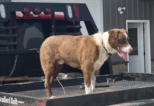 9-month-old Red and White Hanging Tree/Australian Shephard cross. Starting to have a good down and started on his direction with the flag.