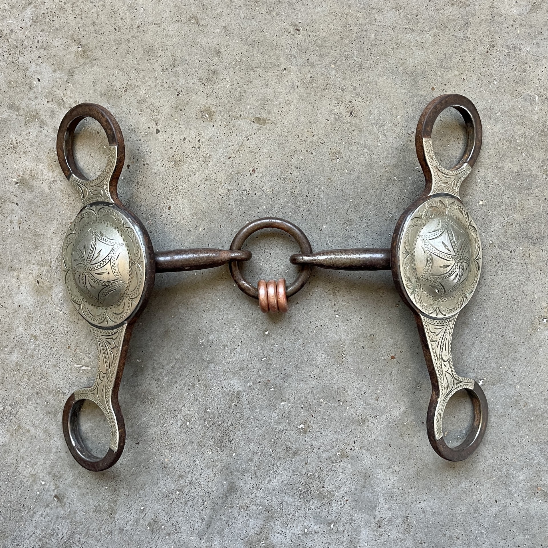 Beautifully engraved Pat Vaughn concho bit with a lifesaver mouthpiece and copper rings. Used but in great shape. Stamped P^