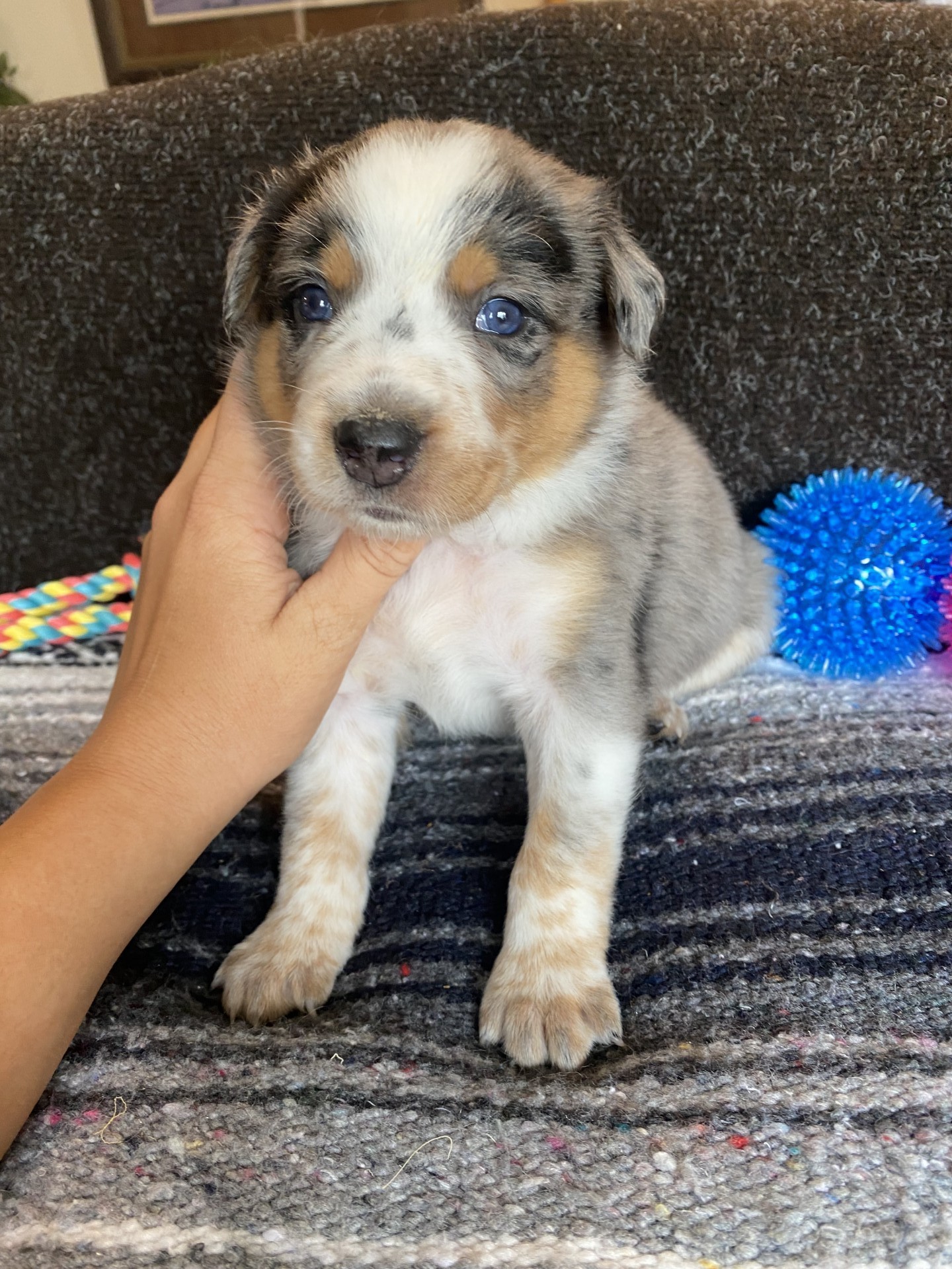 Patch - Australian Shepherd and Heeler, Blue Merle Male puppy. Born August 18th, will be ready October 13th. Out of working parents, we live on a ranch where the parents work cattle every day. Mother is a blue merle Australian shepherd and father is a red heeler. This litter of puppies has had the best color markings that we’ve ever seen! Puppies should be very smart and sound minded, feel free to ask about the last litter from these parents and how they turned out! More pictures are available of the puppy, as well as the parents.