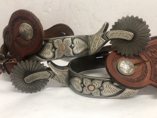 Unworn spurs and straps by Kevin Burns of the Texas Panhandle. Spurs have his early block stamp, 2" rowels, 1 1/8" bands, 3 3/8" heel openings, 2 3/8" shanks. The buckles have his newer mark. Hard to find his spurs with buckles. We pay shipping within the 48 states and accept most forms of payment.