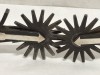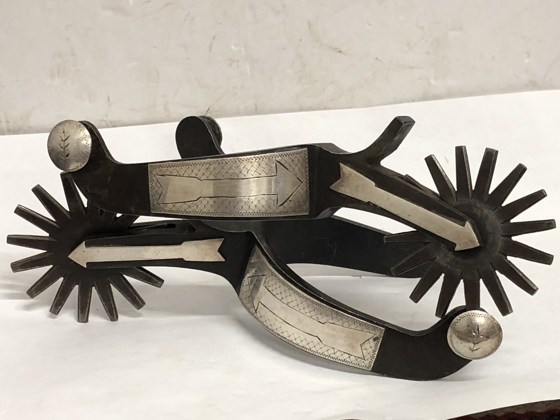 Collectible pair of spurs by the late Louis Bryant of Tecumseh, Ok. He passed 20 years or more ago. His works are still popular. This pair features 2.5" rowels, 2 7/8" shanks, 3 3/16" heel openings that can be widened. Mounted the same on both sides. We pay shipping within the 48 states and accept most forms of payment.