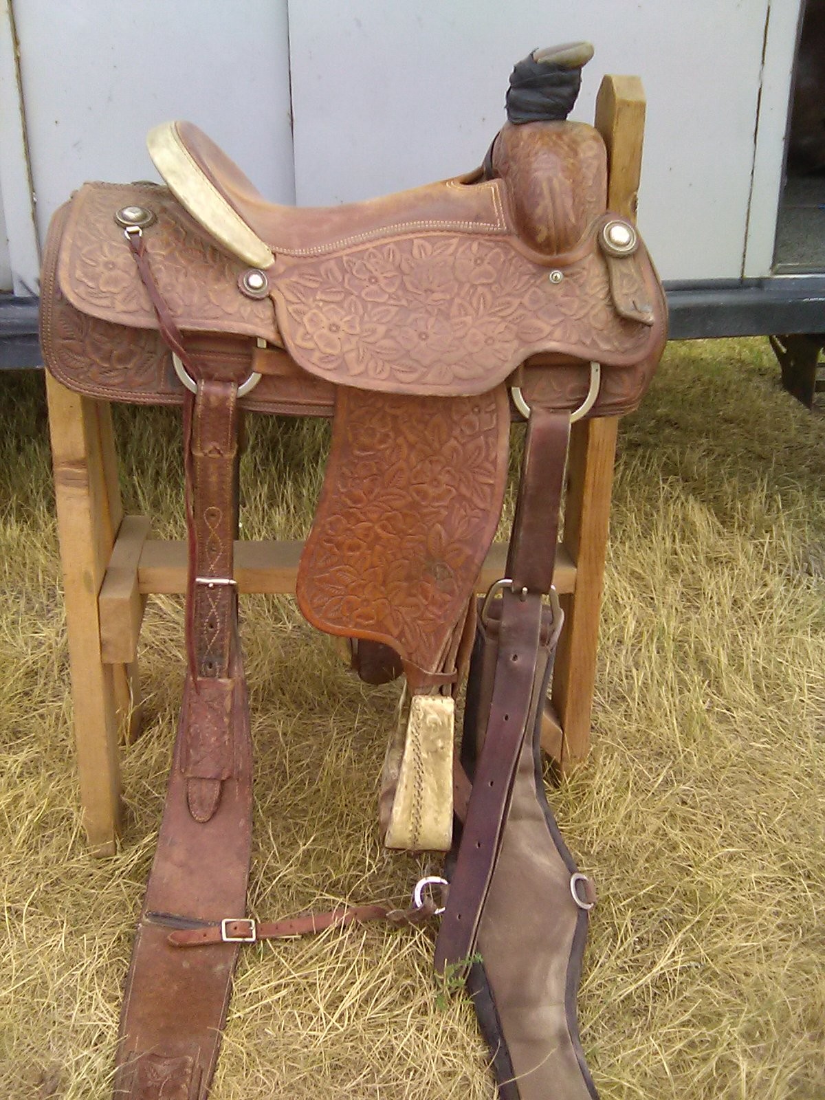 Have owned this saddle for 37 years, fits a horse like it should, been on a bunch. Fully carved with Rawhide bound cantle board and stirrups.