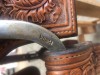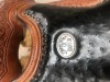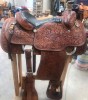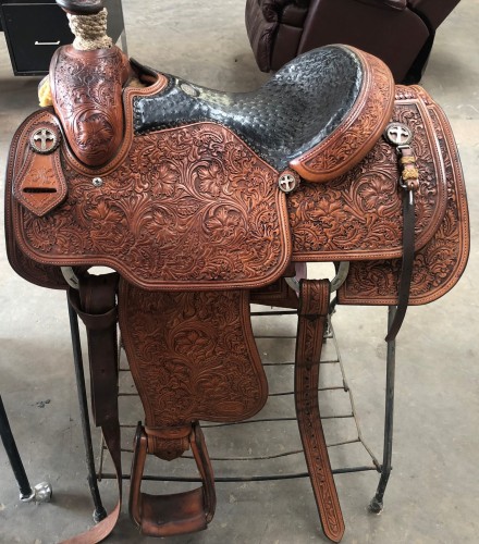 TROPHY TACK made and marked saddle in top condition. Back of fenders have very, very little sweat marking. Has original stirrups and wide back cinch. Ostrich seat. NICHOLS on back of cantle. Made by their long time maker Cory Stork and tooled by their top tooler Terrill Snyder. 15" seat. $60.00 shipping within the 48 states.