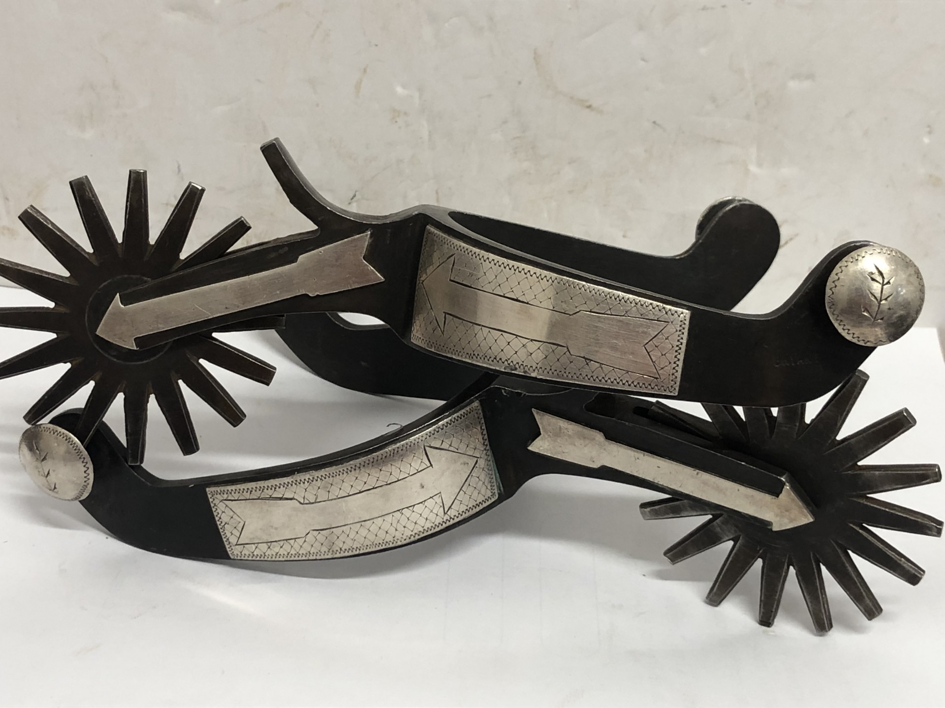 Collectible pair of spurs by the late Louis Bryant of Tecumseh, Ok. He started making spurs in the 1930’s and made till the 1990’s and passed in 2000. His works are still popular. This pair features 2.5" rowels, 2 7/8" shanks, 3 3/16" heel openings that can be widened. Mounted the same on both sides. We pay shipping within the 48 states. We accept most forms of payment.