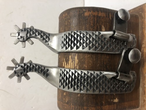 DAN 2021 marked unworn spurs by Texas maker Dan Wisely. Mr. Dan makes a quality pair and spends about 15 hours on each pair. The swingers are stout made and the rowels fit as good as anybody’s. 15/16" bands, 1 7/8" shanks, 1 3/16" rowels, 3 1/4" heel openings. We pay shipping within the 48 states and accept most forms of payment.