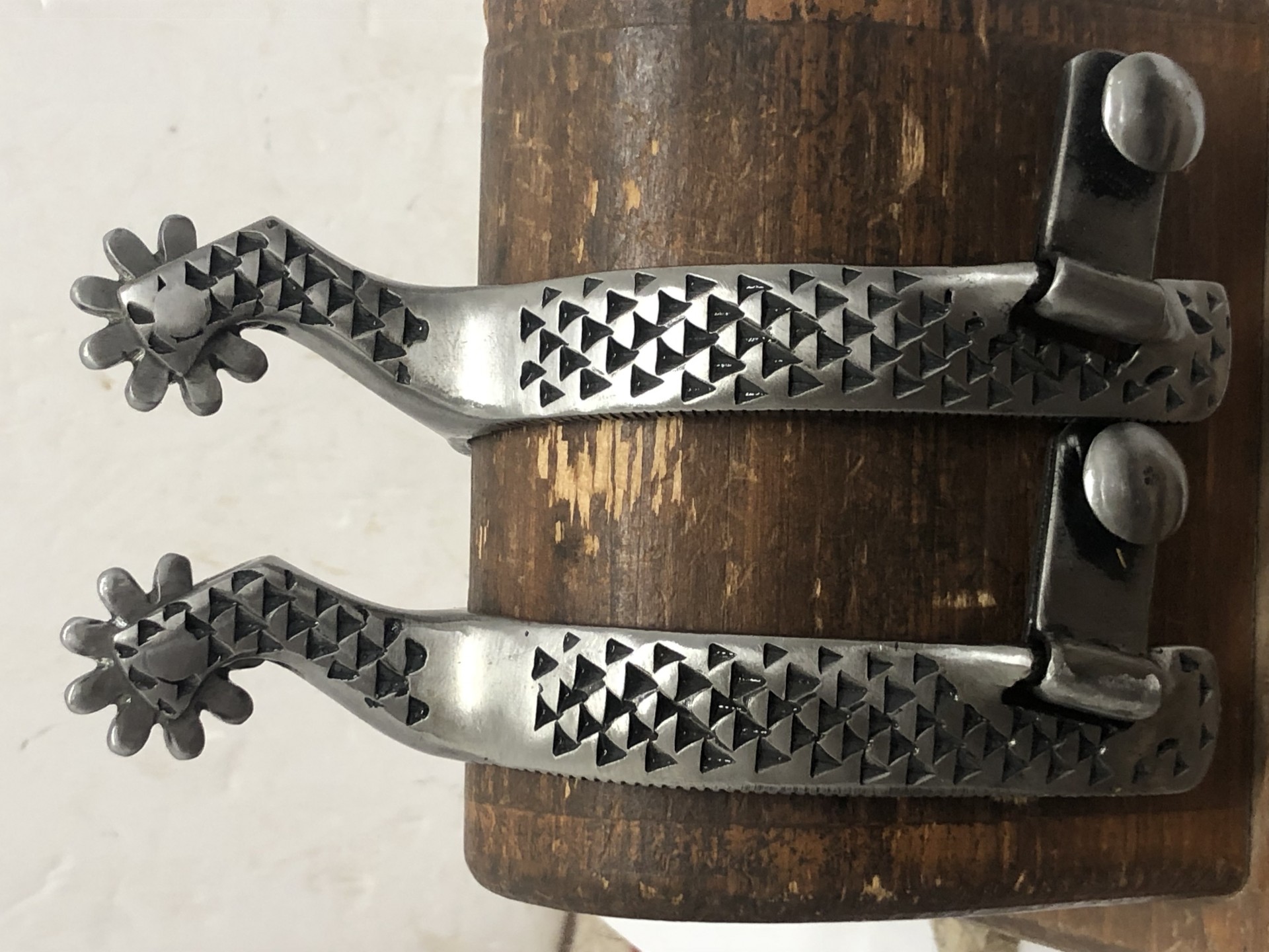 DAN 2021 marked spurs by Texas maker Dan Wisely. Quality made in a hard to find roper style with 3/4" bands, 3 1/4" heel openings, 1" rowels, 1 3/4" shanks. Stout made swingers and the rowels fit and spin very smoothly. He does top notch work. We pay shipping wihtin the 48 states. We accept most forms of payment.