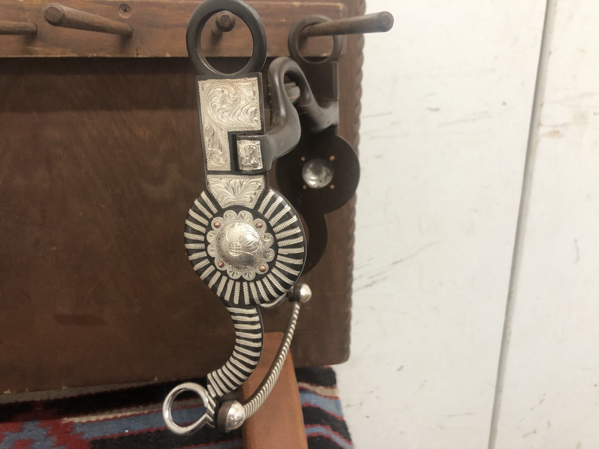 Unused CHARLIE’S marked bit with many copper inlays in the 5 1/4" mouth, with silver inlaid 7 5/8" cheeks. Much finished to this well done horseman’s tool. We pay shipping within the 48 states and accept most forms of payment.