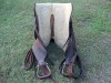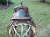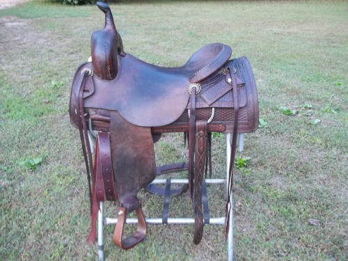 This is a custom made Calvin Allen cutting saddle made in Weatherford, Texas. It is a 16 1/4 inch hard seat. This saddle has basket tooling with barbed wire border. The seat, jockeys, and fenders are rough out. The overall skirt length is a little over 27 inches, the horn is 4 inches tall, and the cantle is 3 1/2 inches. The wool is in very good condition as is the rest of the saddle. The Nettles stirrups are like new. You can still see the logo on the treads. There is no front girth but a matching back cinch is included. PAYPAL only. Call for details