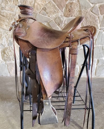 15.5" seat on a 4x90 tree. Made by Porter Rix. Half breed basket stamp, 7/8 flat plate rigging. Has a 5 inch horn and a Cheyenne roll. Couple of the saddle strings could stand to be replaced, they’re still all there but broken on one side of the bleed knots. Still can be used to tie stuff to the saddle though. Also I’m going to keep the stirrups pictured but I can put on 5" tin bells. Asking 5k. Contact Bob at rdmallory90@gmail.com or 503-608-0584, call or text okay.