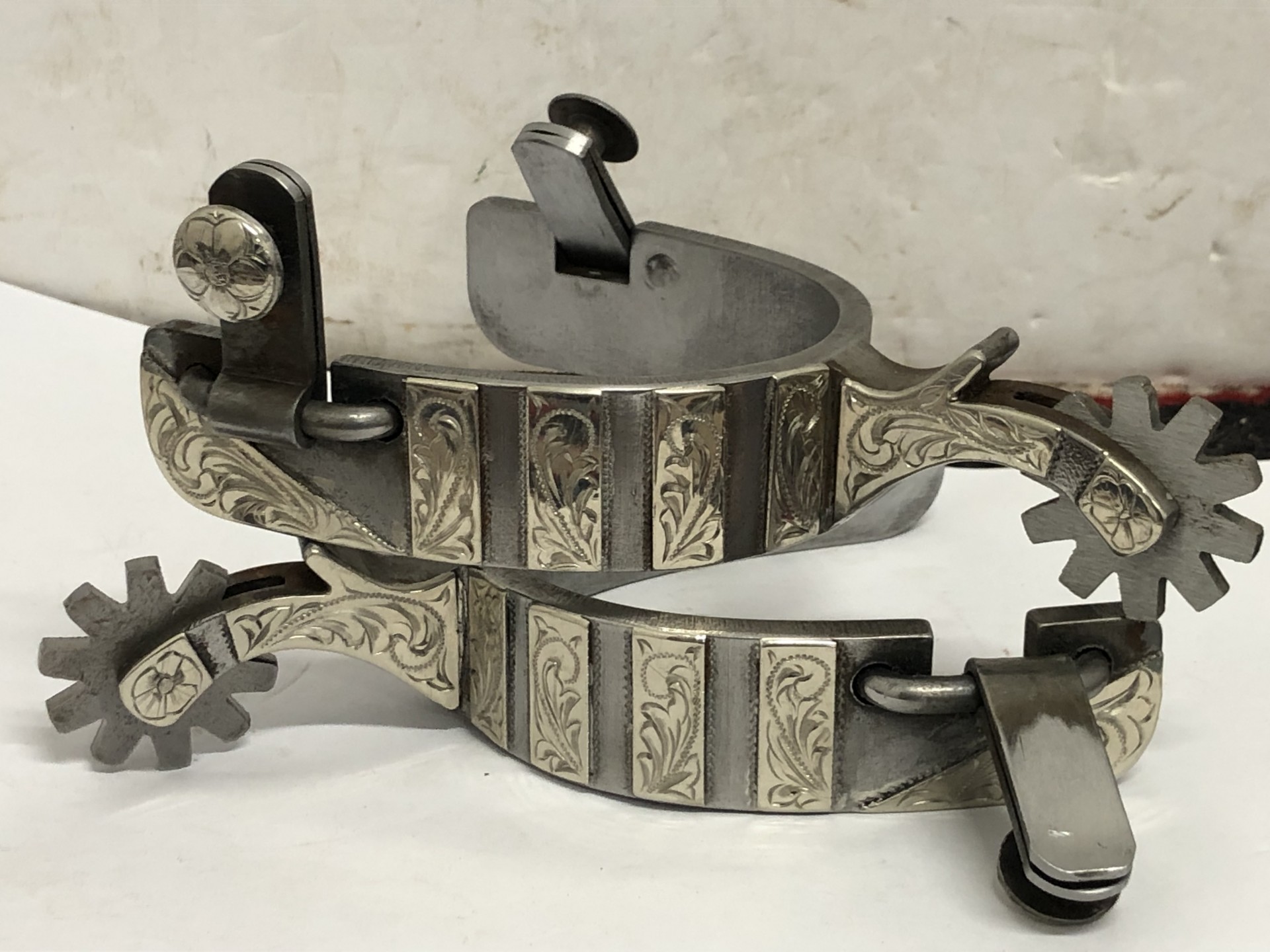 Good using spurs built to use and last, with some weight, marked KG. Made by Kenny Giannini of Arizona. Unused and feature 1" bands, 2 7/8" heel openings that can be spread, 1 15/16" shanks, and easy change 1 1/4" rowels. Harder to find this size. We pay shipping within the 48 states and accept most forms of payment.