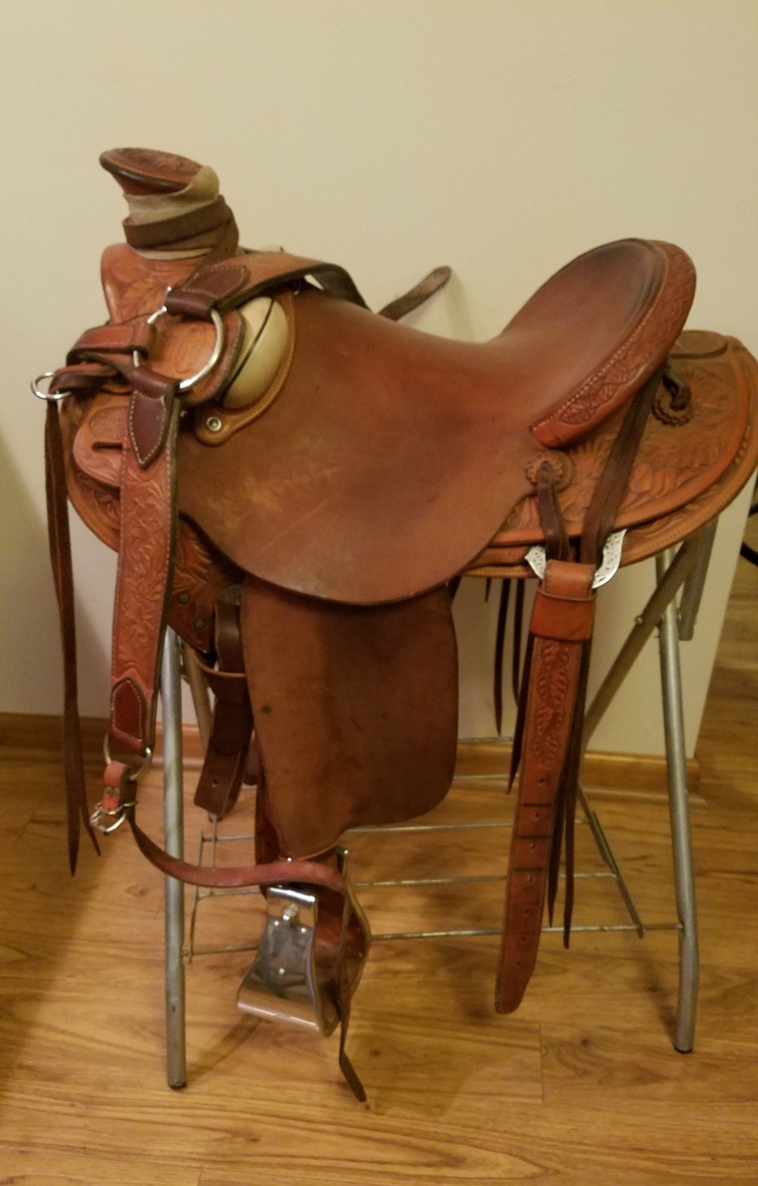 Very nice Watt Brothers half breed with tooling. 15" seat on a 90°tree. This saddle is super comfortable to ride, and fits all of our QH great. This saddle has had gentle use and is in great condition. Comes with martingale