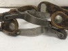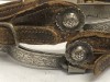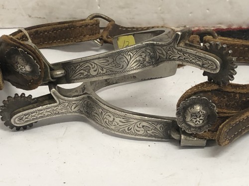 CROCKETT marked spurs with vintage leathers. This is nice pair to use and are collectible. I would like to know who did the silver work. This silver has a early California look. This look like a custom order pair. Not sure of the history. 3 1/4" heel openings, 2" shanks, 1 1/8" rowels. Neat pair. We pay shipping within the 48 states and accept most forms of payment. #12