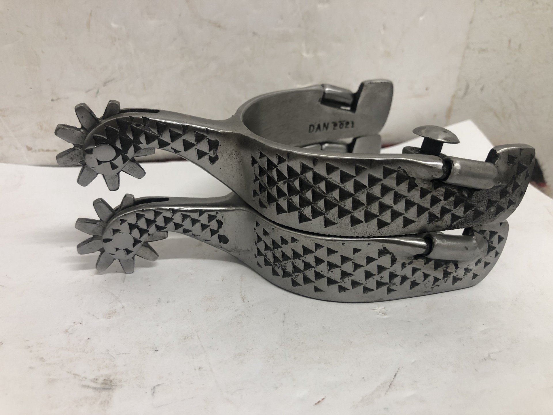 DAN 2021 marked spurs in unused condition. 1" bands, 3 1/4" heel openings, 2" shanks, 1 1/4" rowels. Well made for sure ’nuff cowboy use by NE Texas maker. We pay shipping within the 48 states and accept most forms of payment.