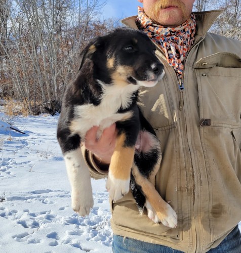 10 week old tri color pups out of a lilac colored female border collie that is a push style dog but will bite on the head end. The male these are by is a big black and tan English shepherd Kelpie cross, he is a very aggressive head dog. These pups are very social, and friendly. UTD on shots.