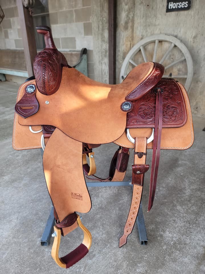New 16.5" handmade Ruelas Ranch Cutter saddle, Herman Oak leather, rough out seat, jockeys n fenders, tooled pommel , cantle & top skirt, deep pocket for the best ride, Montana twist preturned stirrup leathers, top quality, this is a great working saddle with the looks to go to show pen!