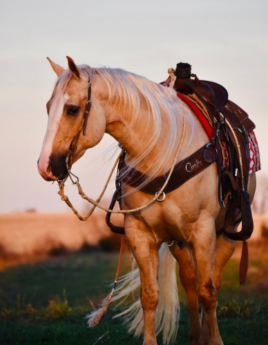 Steppin On Dreams is a stunning, 5-year-old, palomino gelding. He is royaly bred being a grandson of Magnum Chic Dream with Gallo Del Cielo, Smart Chic Olena, Wimpys Little Step and Shining Spark also all on his papers! Dreamer’s sire, Steppin On Sparks, had an LTE of $108,965 with the NRHA. Dreamer’s mother, Maggie Chic Dream, had an exceptional show career, as well. Maggie Chic Dream had earnings of $45,000+ and was an NRHA Non Pro Futurity Finalist. Dreamer stands 15 hands, weighs 1250 lbs and has a beautiful, platinum mane that flows nearly two foot long! He is built very correct- with a deep shoulder and hip angle and strong back. He has a massive hip and great size of hoof and bone! Dreamer is a trained reiner and has been shown with the NRHA. He does all the reining maneuvers with ease and athleticism! He as an extremely soft and collected trot and lope. Dreamer has a great handle and travels very levelheaded. Dreamer has been used extensively on the ranch to check broodmares, check fence and push cattle. Dreamer has also headed a good number of steers out of the box and is well on his way to making a nice, finished head horse. He is very cowy and stands calm in the box. Dreamer does a very nice job on the trails and is sure-footed on all terrain. He has also gone through extreme trail course obstacles like hanging taps and elevated obstacles with ease. Our kids love to ride Dreamer, they feel perfectly safe on him and he gives them a lot of confidence. Dreamer definitely takes care of his rider. We also think Dreamer would do exceptional in ranch riding and ranch versatility classes. Dreamer stands very quiet while being clipped, bathed and for the farrier. He hauls very well. Dreamer is 100% sound and has zero health issues. If you are looking for a once-in-a-lifetime horse, make sure to check him out! He can do it all and is safe for anyone! We can’t wait for Dreamer to find his forever home!