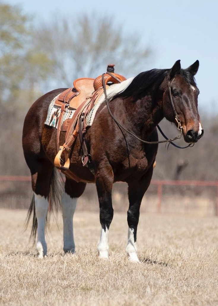There’s a new sheriff in town and he’s large and in charge. Sheriff is a fancy draft cross gelding that stand 16 hands tall. He has all the color and confirmation you could ask for. Sheriff is the type of gelding that can sit all winter and will saddle up just like the day you left him. He’s had multiple jobs in his life and knows what a day’s work is. Sheriff has been used on a big outfit gathering, sorting, and branding. You can rope cattle outside in the pasture or turn around and take him to the arena. He is trained on the head side, stays calm in the box and will let you keep a good handle on your cow. It’s always a pleasure just riding Sheriff he will go whenever you point him, whether it’s down the county road or across a creek he stays willing. He has a very simple one hand neck rein and will bridle down when asked. He is super easy with his leads which ever direction you send him he will pick up the correct lead. Sheriff will cue off your feet or the bridle reins, makes him easy to side pass and open gates or move his body around. Overall this big boy checks all the boxes and will be a great addition to any program. BLC Performance Horses – 214-500-1182