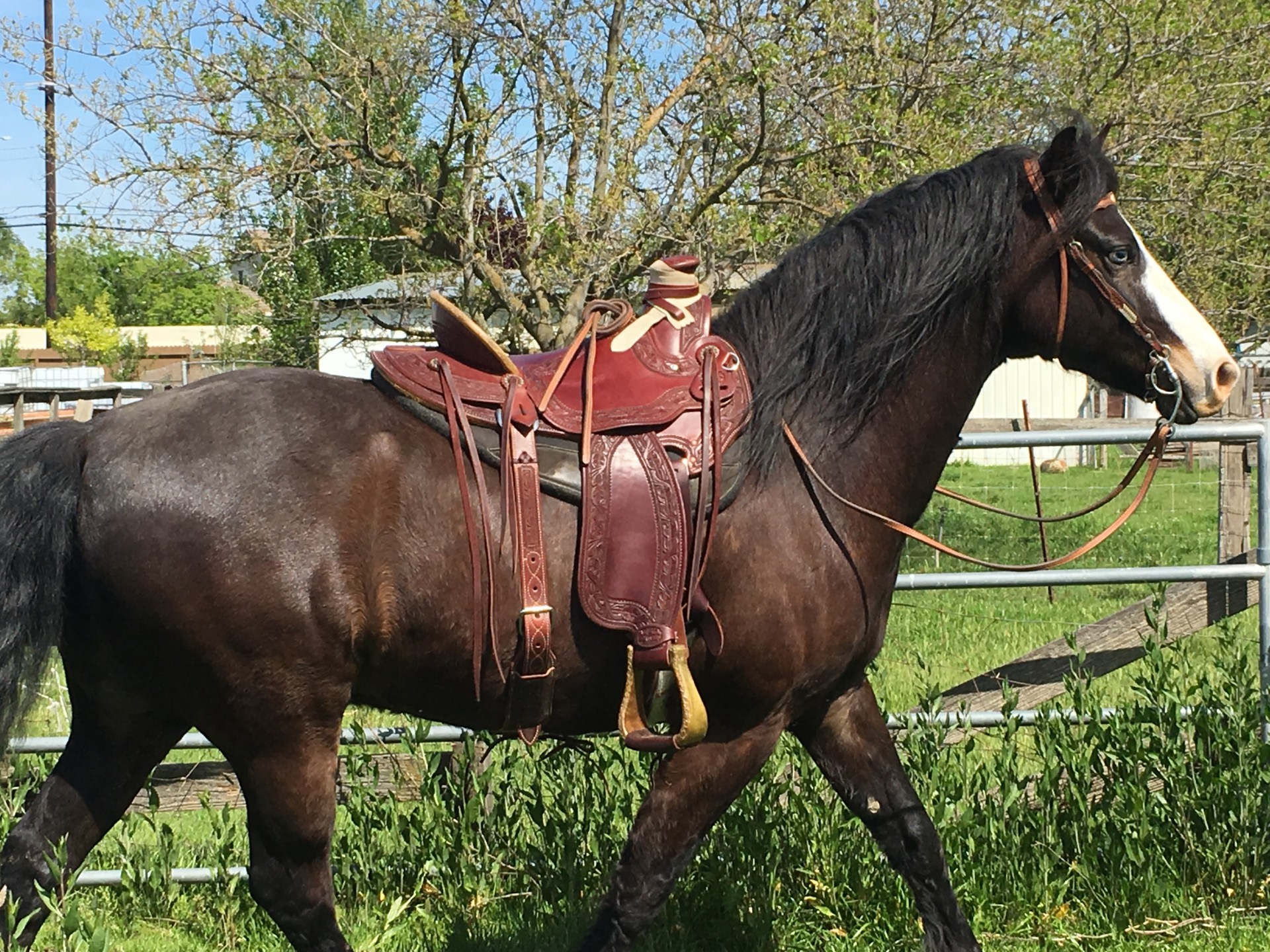 Dark brown, full pepper leaf border tooling, rawhide trim on cantle, rawhide stirrups, stainless hardware, pico berry ponchos