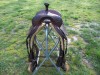 This cutting saddle was made by Tom Block Enterprises Cowboy Supply, Shandon, CA. It is in very good condition with beautiful floral tooling and running W border. It has a 16 3/4 inch hard seat, an overall skirt length of 27 1/2 inches, and a 3 3/4 inch horn. The stirrups are new wooden flat bottoms. This saddle has an inskirt rigging and a back cinch but no front girth. Call for shipping details. PAYPAL only.