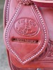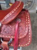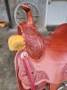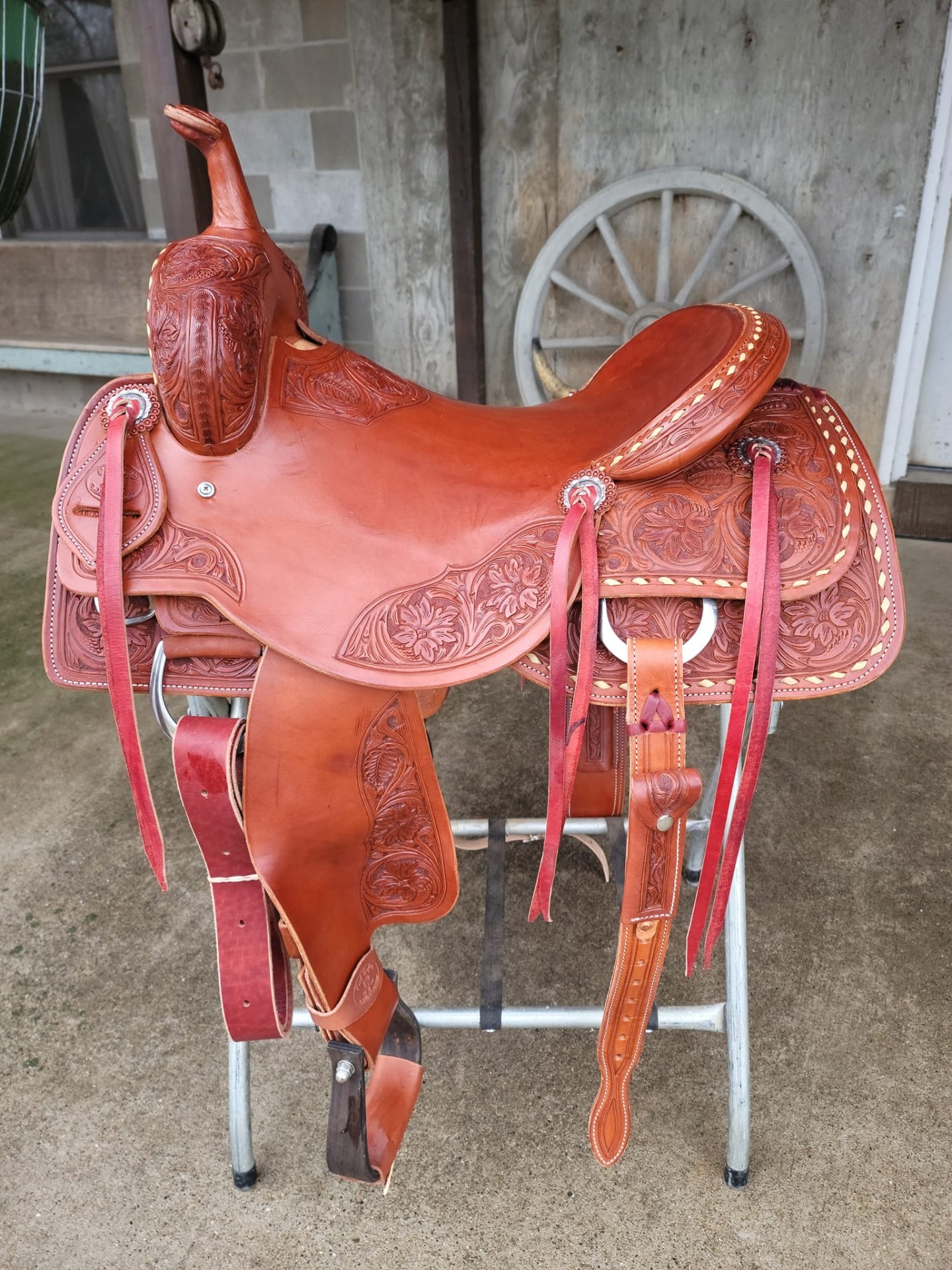 n real wool, smooth with floral tool & buckstitch accent, deep pocket, close contact & tall pommel, pre turn fenders, top quality saddle with alot of eye appeal!!