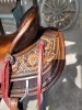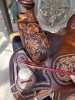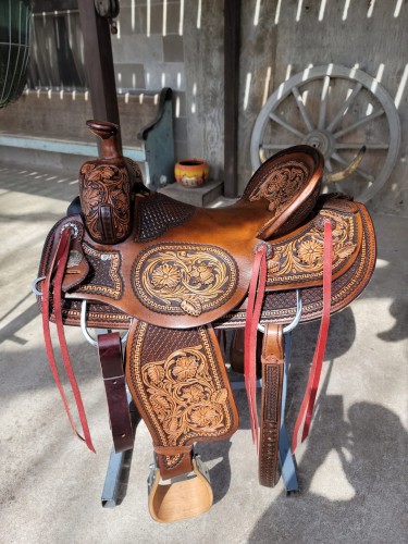 New 16.5" Robert Teskey rancher, Herman Oak, cowboy back pencil roll cantle for deep seat, ranch skirts, two tone antique finish with tooling, this is a gorgeous yet durable using saddle!