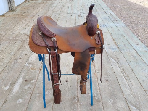 ML Leddys Cutter serial number 5598XS. In excellent used condition. Has a 7.5” gullet and 17” seat. Nettles stirrups. Back cinch with saddle. Rough out with quarter basket stamp tooling. Real wool.