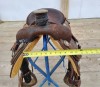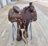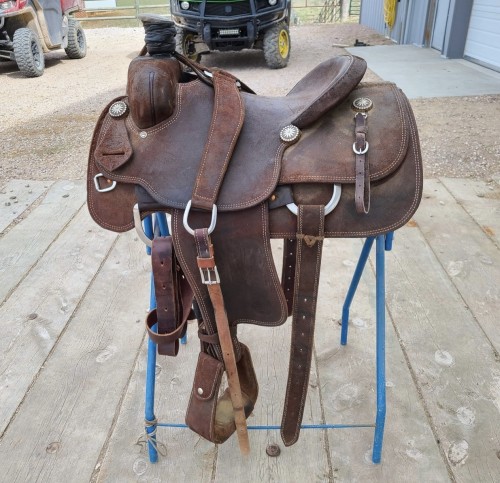 Jody Ramer Team Roping Saddle with 14.75-15” seat in chocolate oiled roughout. Has an 8-8.5” gullet. Semi QH bars. Breast collar and back cinch. Has a hole tear in the rear offside billet - see in photos. In used excellent condition. Buyer pays shipping.
