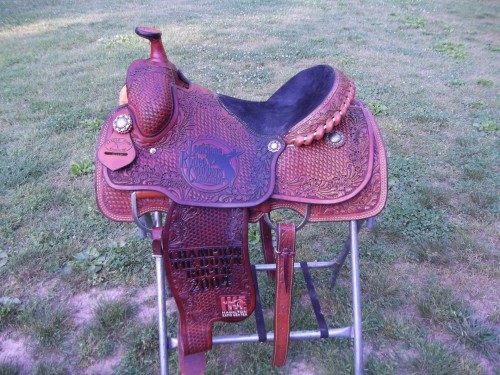 This is a Twister roper saddle. We bought it to have an extra saddle and we sold the horse that we bought it for. I rode it one time and it was new and kept inside as a award saddle. It has a rough out bicycle seat that is 15 1/4 inches in the sitting area. The overall skirt length is 26 1/2 inches. The horn is 3 inches tall with a 2 1/2 inch horn cap diameter. The cantle is approx. 3 1/2 inches tall. The saddle was made in Bonham, Texas. My husband oiled it and I powdered it. It is very comfortable. We are selling it the way we bought it. No back cinch, no front girth, no stirrups, no off billet, or cinch strap. Call for shipping details. Paypal only