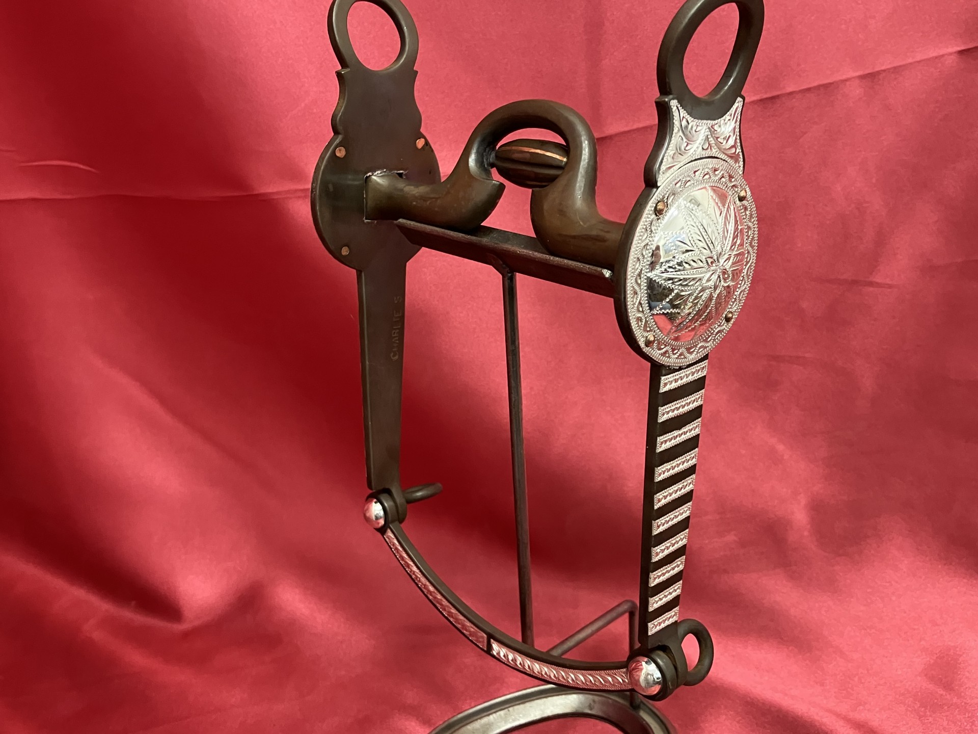 CHARLIE.S* marked bit in unused condition with 5 1/4" mouth and 7 1/2" cheeks. Has balance, many copper inlays in the back of the mouth, solid lip bar, 2 1/4" conchos. We pay shipping within the 48 states and accept most forms of payment.