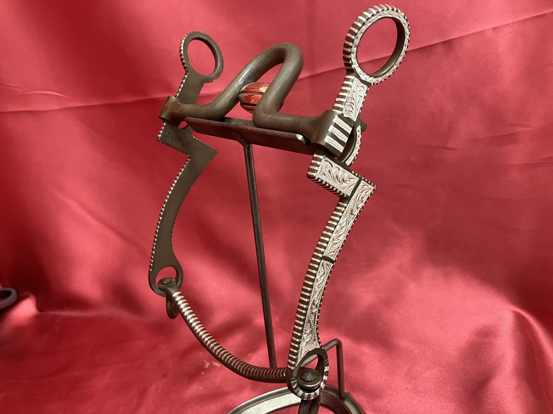 CHARLIE.S* marked 7 cheek with copper inlays in the 5 3/16" mouth. Has copper cricket. 6 5/8" cheeks. Inlaid lip bar. Well done for Charlie.s* by second generation maker in Mexico. We pay shipping within the 48 states and accept most forms of payment.