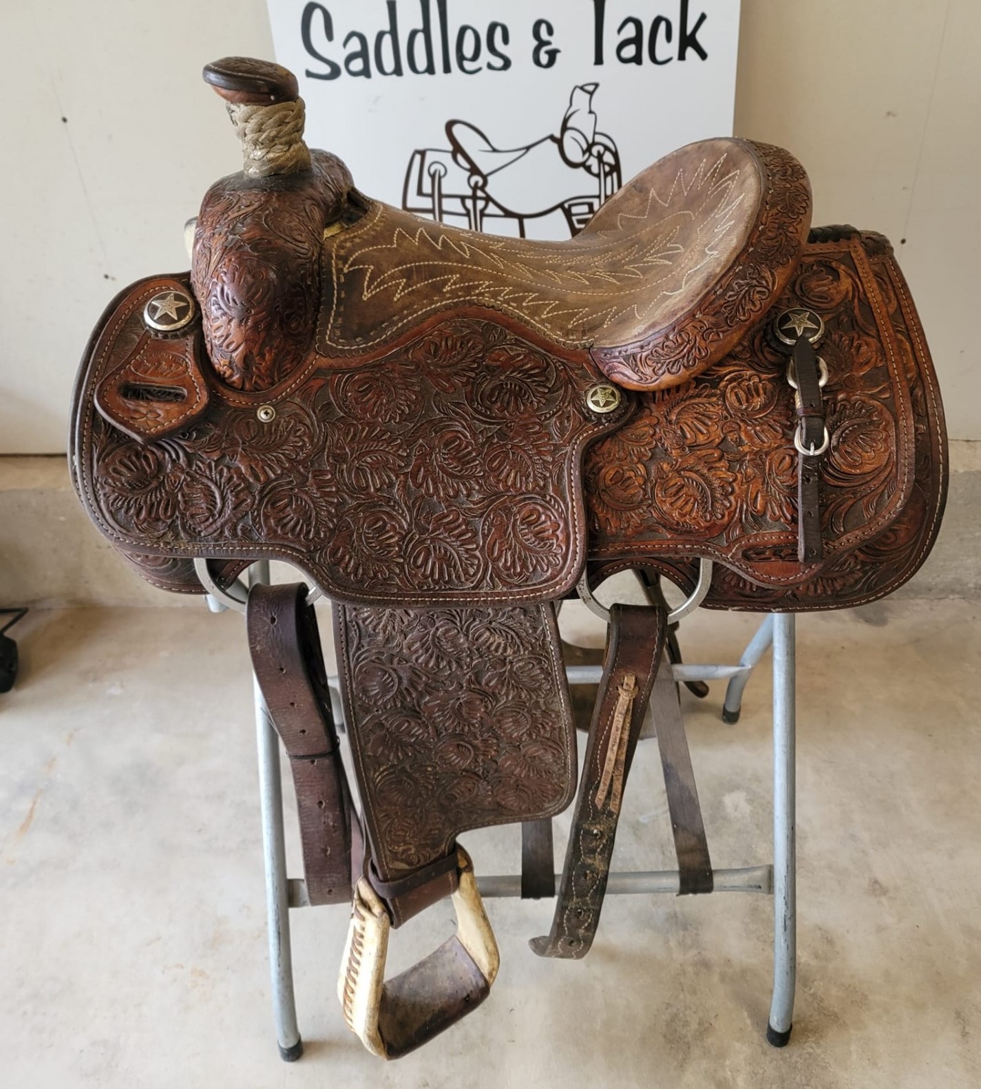 Used 14" Jerry Beagley roper, fully tooled with stitched seat, these are super quality saddles & rare to find a used one for sale, take this opportunity to get you a nice one!