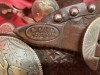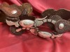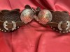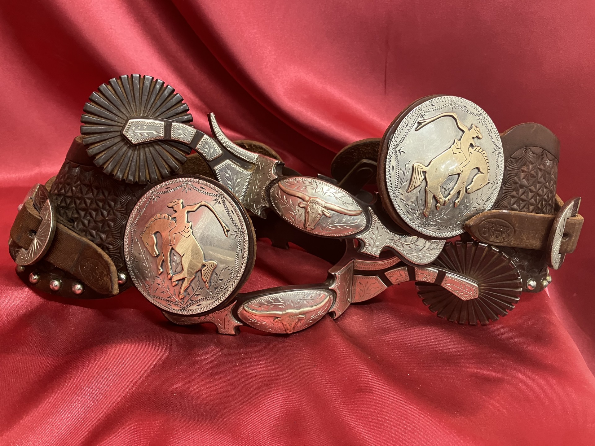 JW marked spurs with his conchos on CCSC leathers with mounted CCSC buckles. The spurs and buckles are by the late Jack Ferguson. The spurs and conchos are by noted maker Jerry Wallace of Madil, Ok. He no longer makes and his works are collectible. This pair features 2 1/2" conchos with brass bucking horse and rider, brass longhorn on bands, 2" rowels, 2 7/16" shanks, 3 5/16" heel openings. These are just going to get harder to find, as they get put in collections. We pay shipping within the 48 states and accept most forms of payment.