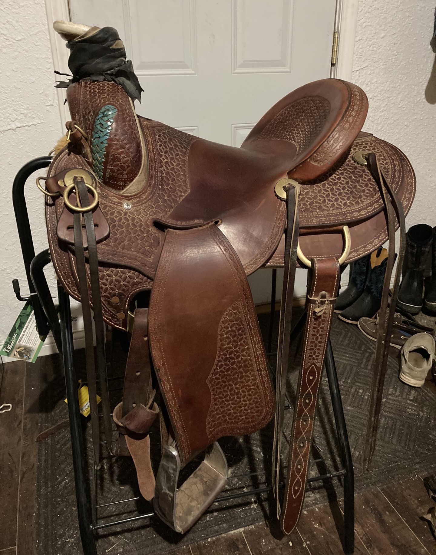 Like new condition. Fits a horse good and has a good ground seat. Only rode one summer since I bought one with a smaller seat. Amish made, with good quality leather and made to last. Custom, unique tooling. Comes with matching pulling collar and back cinch. Price includes shipping