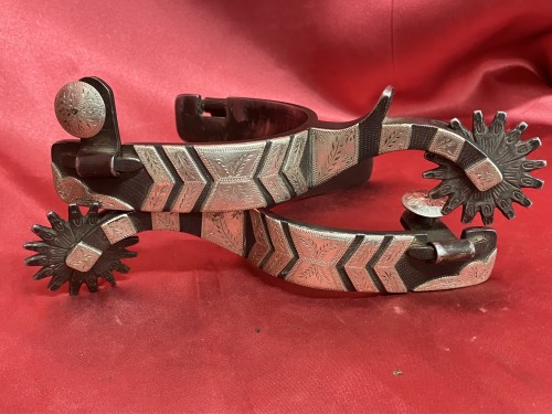 MADOLE marked spurs by Bill Madole of Shawnee, Ok. Mr. Bill no longer is making. His works are collectible. He displayed and sold his works at the NFR and the Houston Stock Show for many years. Engraving in the shanks and rowels, 22 pieces of hand engraved mountings, 3 1/2" heel openings, 1" bands, 1 5/8" rowels, 2 3/4" shanks. They have had little or no wear. We pay shipping within the 48 states. We accept most forms of payment.