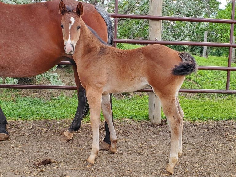 Flashy bay grandson of Paddys Irish Whiskey.Born 5-2-22. “Barnacle” is a bay/bay roan stallion with a left hind pastern that is higher in the back, right hind white ankle, left front coronet higher in back and an irregular stripe on his face. This year our names are ocean plants and animals themed. We suspect that this foal is indeed a roan as he has the white hairs next to his upper tail and that has been trademark on Smarty’s other roan foals.