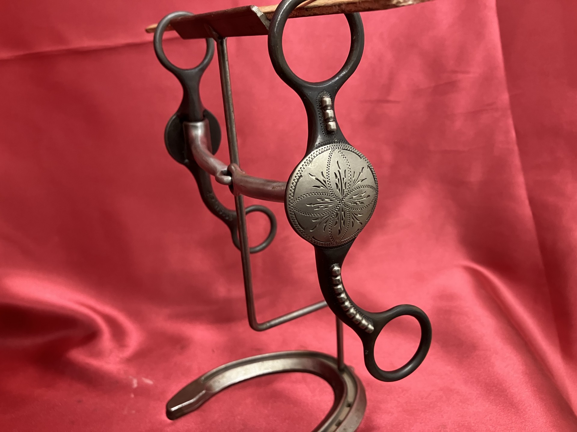WIGGINS 99.SN.22 marked bit in unused condition by noted maker Gary Wiggins. A lot of finish on this one with 6 1/8" cheeks, 1 1/2" hand engraved conchos, 5" mouth with copper inlays. We pay shipping within the 48 states. We accept most forms of payment.