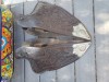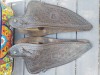 A set of carved Floral design leather tapaderos. They have 21" silver tipped wings. With a carved floral design on the outside wings and a geometric carved design on the inside wings.They were made by R.H. Rhodes in Kansas City, Mo. in the 1930’s. They are stamped by the maker. They are made of heavy saddle leather and still have stirrups in the tapaderos. There are no rips, repairs or dry leather on them.