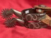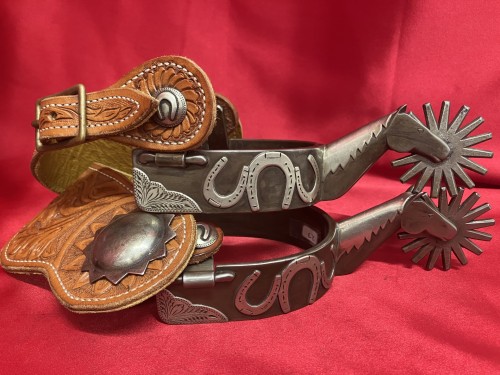 Unworn AW 10 168 marked spurs by top maker Anthony Wallace of Madill, Ok. Very collectible pair with tooled leathers and 1 3/4" conchos. The conchos appear to be sterling and have some faint initials engraved in the. Fully double mounted with 2" rowels, 2 9/16" shanks, 1 1/4" bands, 3 1/2" heel openings. Quality pair!! We pay shipping within the 48 states and accept most forms of payment.