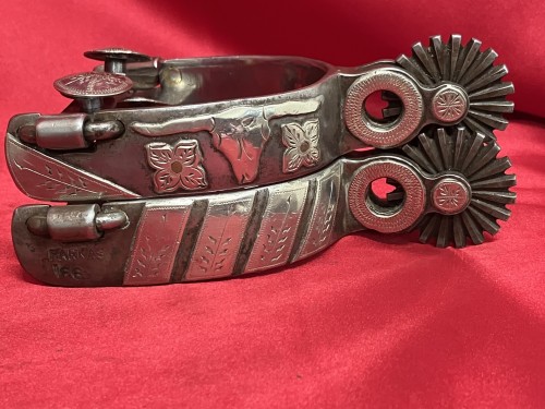 Very good pair of double mounted spurs by David Farkas and marked FARKAS 166. In lightly worn condition and feature 1" bands, 3 1/8" heel openings that can be spread, 1 1/2" rowels, and 1 1/2" shanks. Nice pair by a good contemporary maker. We pay shipping within the 48 states and accept most forms of payment.